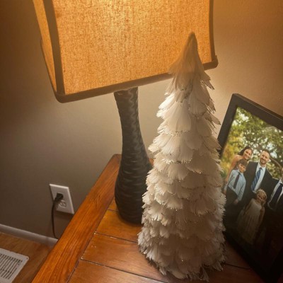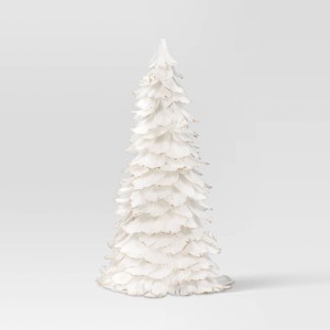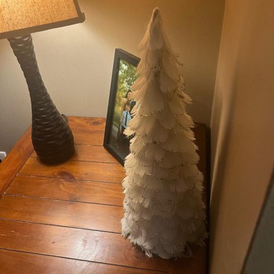 A: The tree is covered with white feathers and has gold-tone tips for an elegant touch.