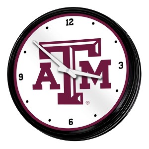 This premium Texas A&M University Retro Lighted Wall Clock will be sure to add the finishing touch to any room in your home or office. This piece is injection molded and features a high-resolution, high gloss digitally printed face. Comes with an 8 foot power cord and an on/off pull switch for the light. LED illuminated. Hanging hardware and light bulb included. This is an officially licensed product of the Aggies and made in the USA.