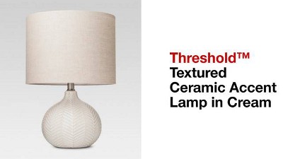 Style and function come together in the Textured Ceramic Accent Lamp from Threshold™ to bring incandescent style to any space in your home. Combining a rounded cream-colored base decorated with a herringbone pattern and silver hardware, this lamp is capped off with a simple, natural lampshade for complete elegance. Pair with a wide variety of furniture styles for a versatile indoor lighting option you'll love. This lamp is available for purchase with or without a bulb.