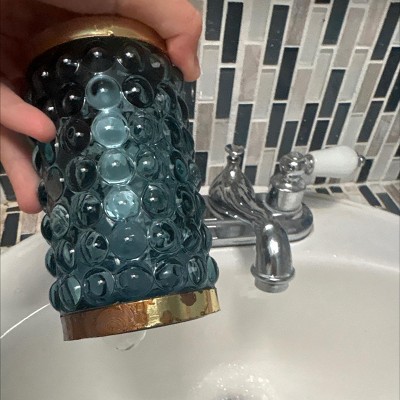 This glas soap dispenser is so pretty. The blueish bubble glass and gold accents is so chic and stylish. Nice, thick and solid glass. Well made and a beautiful compliment to any sink area, kitchen or bathroom. Far exceeded my expectations and a good value as well. Make your space look luxe on a budget. For sure grab this.