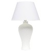 A charming and practical 20.08" table lamp to meet your fashion lighting needs. This lamp features a white curvy shaped textured stucco ceramic base and matching white fabric shade. Perfect for living room, bedroom, or office, this lamp is sure to satisfy both your decor and lighting needs for your home or office!