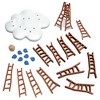 Players take turns rolling a die to determine how they must place their wooden ladder (must touch one other ladder, two other ladders, or be the highest point)