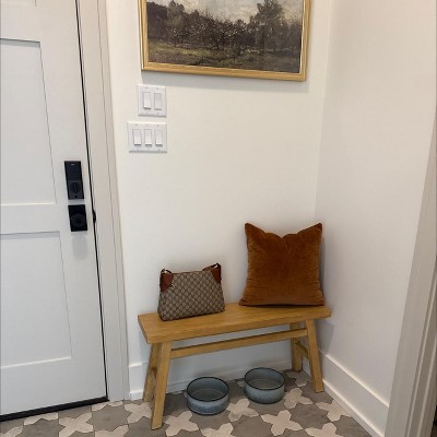 I searched forever for the perfect size, color, design and height and this met all my criteria. It’s perfect for a small entryway/mudroom! It’s the best neutral, light oak wood color, making it so versatile for a variety of decor styles. It makes a great stool to sit on and put on/tie your shoes. Since I’m constantly switching purses, I love to put the purse I’m currently using on it by the door, making it easy to find and grab on my way out! One of my favorite things is the design put into the height of the bench. I can fit my dogs’ water bowls underneath it and they have plenty of room to drink from them (and they’re big dogs!) Oh, and it came fully assembled! Definitely recommend for any small space in any room of your home!