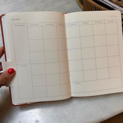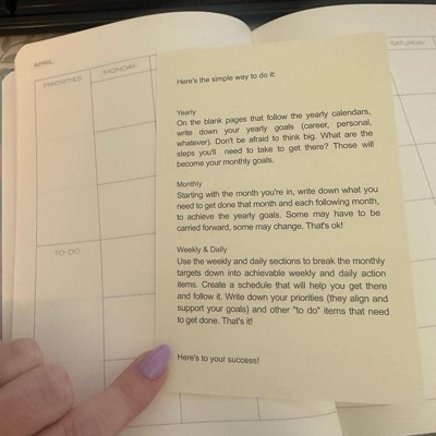 [This review was collected as part of a promotion.] This feels like a high quality planner . The pages are not flimsy. There are blank calendars at the beginning of this book; you write the year yourself . The pages have daily, weekly and monthly spots to help keep you organized, and help achieve your goals. There is also a section for journaling. I highly recommend this planner!