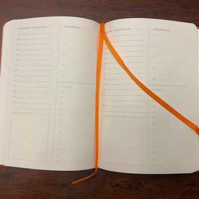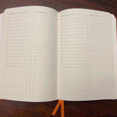 [This review was collected as part of a promotion.] This planner is cute and a nice hard cover bound journal that is like a book. It does not have specific year or dates in it for the calendar which is nice because you can start whenever and have 12 months of your choice you just write the days in your self. It came I. A cute little wrapped box which would be awesome for a college grad gift. The cover and unique daily planning breakdown.