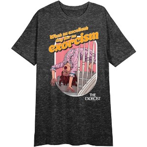 Ignite your night with this women's black heather The Exorcist crew neck short sleeve night shirt. Watch as a possessed Regan crawls upside-down, surrounded by yellow letters that read, "What An Excellent Day For An Exorcism." Made with cotton, this officially licensed night shirt ensures both comfort and horror-inspired style. Care is a breeze. Simply machine wash this night shirt on cold with like colors and tumble dry on low heat.