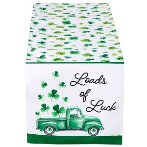 Add a festive touch to your dining room with our St. Patrick's Day Table Runner. The charming shamrock design with a delightful green truck proclaims "With Loads of Luck'a perfect blend of fun and sophistication. The Loads of Luck Table Runner stretches beautifully across your table, providing a seamless backdrop for memorable meals. Whether it's a family dinner or a lively gathering, these pieces are sure to bring a joyful spirit and a hint of Irish charm to your festivities. Key Features:HIGH-QUALITY MATERIAL: Crafted from durable polyester, ensuring long-lasting use and easy maintenance.FESTIVE ST. PATRICK'S DAY DESIGN: Adorned with a charming shamrock design and a delightful green truck, adding a festive touch to your dining room decor.SEAMLESS TABLE RUNNER: The Loads of Luck Table Runner stretches beautifully across your table, creating a seamless backdrop for memorable meals and festive gatherings.PERFECT FOR FAMILY DINNERS AND GATHERINGS: Whether it's a cozy family dinner or a lively St. Patrick's Day celebration, our Loads of Luck Runner bring a joyful spirit and a hint of Irish charm to your festivities. Made of: Polyester Measurements: Runner, 72"W x 13"L