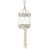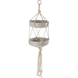 Double-tiered Macrame Bird Feeder and Waterer is a full-service stop for your feathered friends! The upper-level tray holds refreshing water while the and lower-level food tray provides food. The lower tray has drainage holes to help keep the birdseed fresh. With birds perching on the trays themselves, it's like having a ringside seat to your own wildlife show'don't forget to grab your camera! The feeder hangs effortlessly from a strong metal loop, making setup a breeze. Whether you're a seasoned bird watcher or just beginning your birding adventure, this feeder is perfect for creating a welcoming haven for your feathered friends. Made of: Cotton and plastic Measurements: 6-1/2" dia. x 24"H