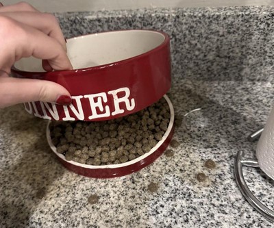 - The Red large bowl reads "Dinner" and its small bowl reads "Drinks