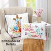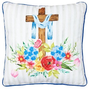 Add a touch of Easter elegance to your home with the Religious Cross Butterflies Embroidered Decorative Pillows. These pillows are an invitation to relax with grace and beauty. The Cross pillow features an intricate cross adorned with a wreath of spring flowers, set against a backdrop of subtle grey stripes for a classic yet contemporary look. Its blue hem tape finish adds a refreshing accent that complements any decor. Grow with Grace invites warmth into your space with vibrant spring flowers and butterflies, beautifully juxtaposed with blue stripes and playful pom poms lining its edges. Perfect for anyone looking to infuse their living area with a sense of renewal and positivity, these pillows are crafted to inspire and comfort. They are a gentle reminder of hope and new beginnings. Designed to effortlessly blend with your existing decor, they offer an easy way to refresh your home for the season. Experience the joy of transformation with every glance.Key Features:CELEBRATE SPRING: Vibrant, spring-themed embroidery that adds a festive touch. EXPLORE UNIQUENESS: Intricate design elements and premium trim give the pillow a sophisticated look. ELEVATE YOUR SPACE: Decor coordinates seamlessly across a variety of styles. EMBRACE RENEWAL: Bring a sense of hope and celebration into your home. DECORATE WITH EASE: Versatile pieces aer perfect for seasonal decoration and beyond. Made of: Polyester and polyfill Measurements: The Cross, 18" sq. Grow with Grace, 12" x 18" Notes: