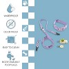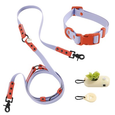 - Collar and leash are a two-toned purple design; bag dispenser and waste holder are almond