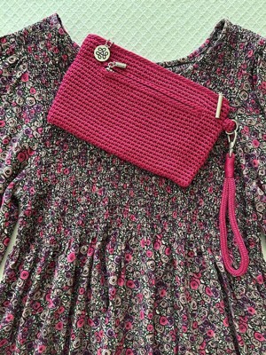 [This review was collected as part of a promotion.] I love this small crocheted clutch in pink. It’s beautifully made with attention to detail. Fits my phone and small wallet and lipstick, and key fob.
