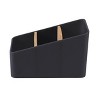 This nifty organizer is perfect to keep your desktop, countertop or workspace tidy and clutter-free. The sleek black with bamboo dividers fits with any decor. This organizer has 3 compartments that perfectly fits pens, pencils, notes, clips and other desktop items. This unit measures 3.75" W x 6.1" L x 4" H. Additional coordinating items available (sold separately).