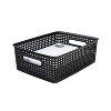Thinkspace Plastic Weave Bin, Medium, Black, Pack of 3 | In a busy office or home, storage needs can be as unpredictable as the weather in May. So we created the See Jane Work Weave Bin Collection in a variety of sizes and shapes to solve your unique and ever-changing organizational needs. Organize large amounts of clutter in a matter of minutes with a Medium Weave Bin. Utilize the bins to best suit your organizational needs. Find a spot for your keys, paperwork, or even your favorite pair of socks. Measures 14" x 10.5" x 4.63". Sold as a pack of 3.