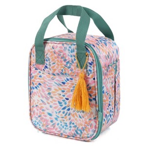 This is a great lunchbox! The storage area is large and can hold a lot of food. I love the extra storage compartment in the from as well as the cup holder on the side. The design is bright and cheerful but also dark enough that it doesn’t show any dirt. The tassel decoration is a pleasant addition as well. Overall, this is a great lunchbox for anyone looking for something that can hold a variety of food while also looking stylish!