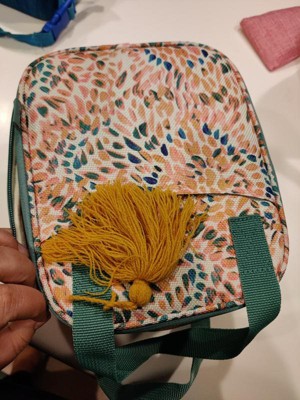 Very colorful lunch bag for school. Enough space for lunch box or container,. Side pocket for water bottle is a bonus. Handy and beautiful.