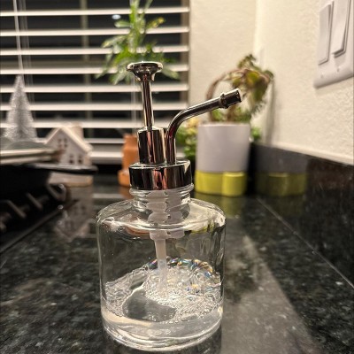 - Clear glass soap dispenser with metal pump makes an attractive addition to your bath collection