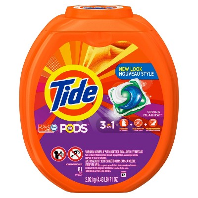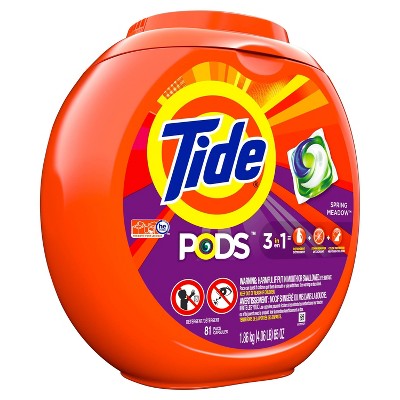 With three-chamber technology, Tide PODS Spring Meadow Scent cleans, brightens fabrics and fights stains. Tide PODS have a built-in stain fighter that cleans the entire load better than a liquid detergent and in-wash Oxi booster combined. It works in front and top loading washing machines, both regular and high efficiency (HE). Its Spring Meadow Scent infuses your laundry with crisp floral notes to help leave your laundry smelling great. Just toss one pac for regular loads, two pacs for large loads and three pacs for heavily soiled loads into the washing machine drum before you add clothes to get an amazing clean. Tide PODS are formulated with HE Turbo technology for 6X the cleaning power in half the time (1). Unlike many other HE detergents that can slow washers down because of too many suds, Tide HE Turbo contains quick collapsing suds and targets tough stains to remove them quickly. So you can get amazing results without the extra rinse cycles to remove the suds. This tub contains 81 laundry pacs. (1) 1 dose of Tide HE Turbo Clean in quick cycle vs. 6 doses of the next leading liquid HE compatible detergent in normal cycle