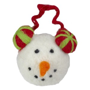 Add this festive ornament to your holiday decor this holiday! This ornament is a snowman’s face that is round, wearing red and green striped earmuffs perfect for small children to assist with decorating the holiday tree. You could also add this piece in the doorways of your home that need a bit of holiday cheer.