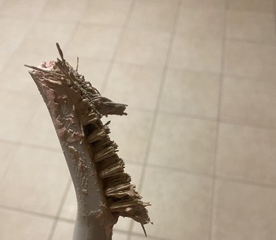 I absolutely loved this brush. The angle of the brush made it comfortable to hold unlike other I bought. The bristles were sturdy together where it really focused on the grout itself and didn’t spread out when putting pressure on it. I bought grout pens but truly this brush and cleaning with the pink stuff was the best result. Will be buying another because mine wore down, I covered and brushed almost a complete room, I’d say about 80% of it with just one brush but Highly recommend! Please see photos where you can spot where I did clean vs what they looked like before.