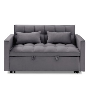Bring both functionality and contemporary charm to your home with the 54.33" Velvet Foldable Sofa Bed. Designed to adapt to your lifestyle, this versatile piece transitions effortlessly between a cozy loveseat and a supportive sleeper with its three adjustable backrest positions. Whether you're lounging with a book, watching TV, or hosting overnight guests, this multi-functional pull-out couch ensures comfort and convenience. Upholstered in soft velvet with a tufted back and seat, it offers a refined texture that elevates your living room, guest room, or apartment. Supported by a solid wood frame and sturdy plastic legs, this convertible sofa bed is built to last. It also includes two soft matching pillows to enhance your lounging experience. Ideal for small spaces, studio apartments, or multipurpose rooms, this sleeper sofa is the perfect blend of style, function, and comfort.