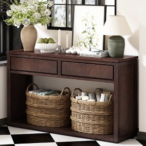 This console table features an exquisite chevron pattern on the tabletop and sides, adding a touch of sophistication to any room. Its intricate design showcases fine craftsmanship and a timeless aesthetic, making it a perfect addition to modern or traditional interiors. The smooth finish enhances its beauty, while the natural wood tones provide warmth and charm to your living space.