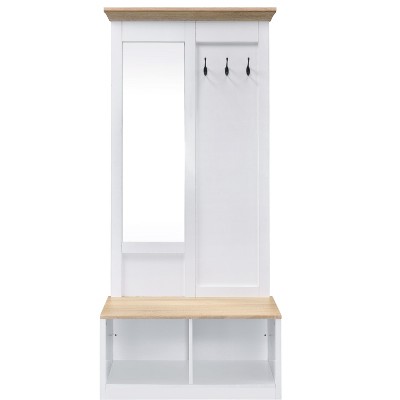 Upgrade your entryway with the Entryway Hall Tree, an all-in-one storage solution designed for modern households. With its cream white finish, this hall tree adds a clean and inviting look to your mudroom, hallway, or foyer. The multifunctional design combines a coat rack, a spacious bench, and shoe storage, allowing you to keep essentials neatly organized in one place. Four double hooks provide convenient hanging space for jackets, hats, scarves, and bags¡ªfreeing up your closet space and keeping everything within arm¡¯s reach. The built-in bench gives you a comfortable place to sit while putting on or taking off your shoes, and the lower compartment stores your most-used footwear or accessories. Crafted with safety in mind, this hall tree includes an anti-tip device to secure it firmly to the wall, making it a stable and reliable addition to busy households. Whether you're coming or going, this organizer helps keep your space tidy, functional, and stylish.