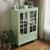 This item is made of MDF board, solid wood legs and tempered glass,which make the cabinet more sturdy and durable, meanwhile the cabinet surface is covered with Eco-friendly painting to make the cabinet smooth and looks more premium. With a classic open glass door + drawer design, the height of shelf is adjustable and removable, and the drawer below also provide enough storage space. It can be placed as a sideboard, storage cabinet, bookcase, display case in the living room, kitchen and bedroom.