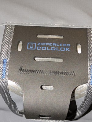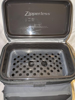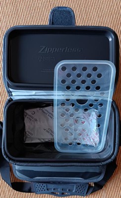 This is a really awesome cooler! Much larger than I had anticipated. It is in fact zipperless, the top of the cooler closes securely almost vacuum-like and it has a Velcro , for lack of better terminology, clasp or cold lock that keeps the top closed. There's a huge front pocket that'll hold about 6 regular size cans or more snacks or whatever your heart desires. It's a rugged cooler that'll stand the test of time. It's also got a nice length shoulder strap and a nice carrying handle!