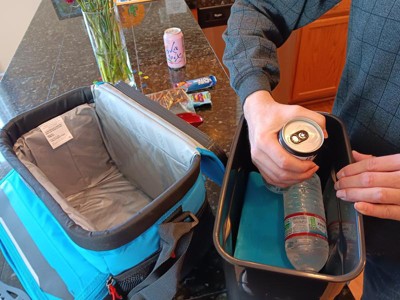 Perfect for day trips and road trips. I really like the handles and carrying strap. The plastic tray keeps the items cool and dry as well as the cans cool. The exterior is easy to clean too. It holds 16 metal cans and smaller plastic bottles.