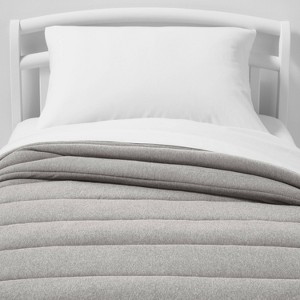 Give your child's bed a modern refresh with this Channel Jersey Comforter from Pillowfort™. This comforter features a quilted channel stitch pattern for a cozy and textured look, and a fern green color to give a soft touch to their bedding. The cotton-polyester blend shell offers soft and comfortable year-round use, while the polyester fill insert adds a layer of warmth to the top of their bed. Coordinate with white sheets and a matching pillow sham to complete their bedding ensemble, and machine wash for easy care.