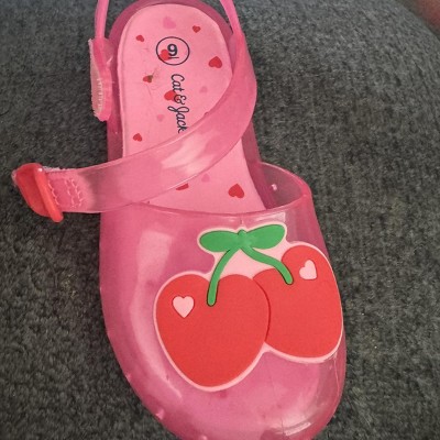 Upgrade their footwear collection with these Lainey Jelly Sandals from Cat & Jack™. These jelly sandals feature a cute motif on the vamp and have an adjustable hook-and-loop closure for a stay-put fit. Designed with a closed round toe, these medium-width sandals are great for everyday wear.