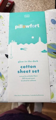 These Pillowfort sheets have a cute space design that my son is excited about. The sheets are a soft high-quality cotton fabric that washes and wears well. The ends of the sheets are marked top/bottom for a faster and easier time when making the bed. I love that these sheets are deep enough to accommodate up to a 16-inch mattress and the fitted sheet corners wrap deeply under the mattress, keeping it in place. Bonus that the fun design glows in the dark after being exposed to light. Overall, a great quality and budget friendly sheet set option that brings style and function together. Highly recommend.