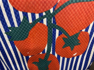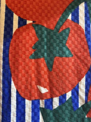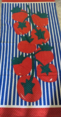 • A: The towel features a fun red tomato print with blue stripes and a red border.