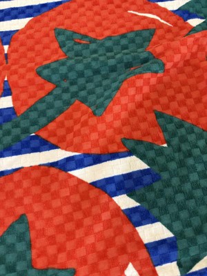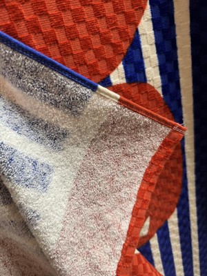 This Room Essentials beach towel is fantastic. It's made with 100% cotton and machine washable. The size is massive and the fabric is pleasantly thick. With the quirky tomato design and gorgeous red, white and blue its a must have for summer fun.