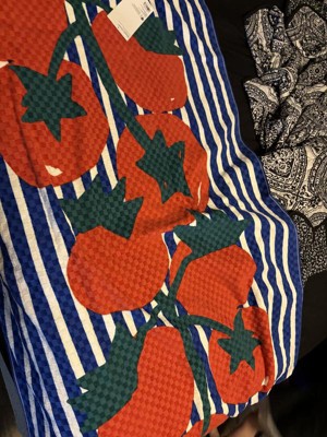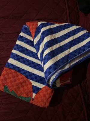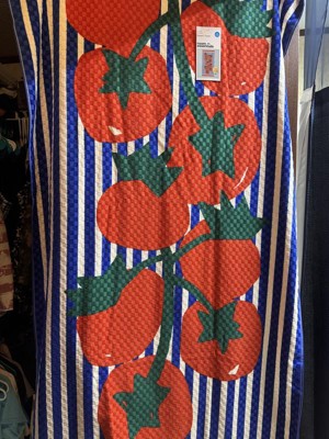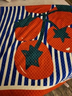 Lounge by the beach or pool in whimsical style with this Tomato Beach Towel from Room Essentials™. Made of 100% cotton terry fabric, this beach towel helps you dry off quickly, and it features a fun red tomato print with blue stripes and a red border for an eye-catching look. It makes a perfect pick for beach vacations, pool parties and beyond.