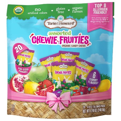 What’s flavorful, fun, and better-for-you, too? Organic Easter Chewie Fruities from Torie & Howard!These unique organic candies in individually wrapped pouches provide the perfect pick-me-up during spring festivitiesFeaturing a variety of juicy fruit candy flavors and a unique chewy candy texture, they're sure to be a hit with your Easter crowdThey're jampacked with Vitamin C, plus perfectly sized for Easter baskets and egg huntsFREE from Soy, Gluten, Artificial Flavors & Colors, Corn Syrup, Wheat, Casein, and Dairy
