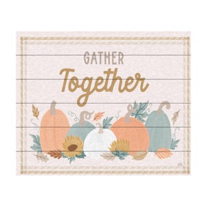 This ready to hang, Wood Slat Art by Trademark Fine Art features an illustration of pumpkins and gourds with the words gather together. Artwork is digitally printed with high end UV inks directly onto natural hardwood planks that have been primed white for a more vibrant, colorful image. This pleasant, real wood piece highlights the texture of the wood creating a truly unique piece of art with no two pieces looking alike. The artwork arrives unframed and is ready to hang with wall hanger already installed to the back.