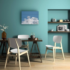 This ready to hang, Wood Slat Art by Trademark Fine Art features a white building with blue and white striped umbrellas. Artwork is digitally printed with high end UV inks directly onto natural hardwood planks that have been primed white for a more vibrant, colorful image. This pleasant, real wood piece highlights the texture of the wood creating a truly unique piece of art with no two pieces looking alike. The artwork arrives unframed and is ready to hang with wall hanger already installed to the back.