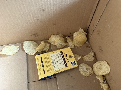 I order many things online, as my closest Target doesn't carry many items I want. I L-O-V-E Target - however, when a box arrives intact with Target tape and there are chips throughout the box making everything greasy, I'm flabbergasted that someone in packaging tore open the chips (to eat some) and then put them in the box :(. ?????
