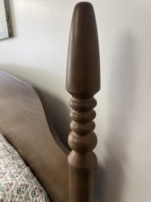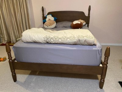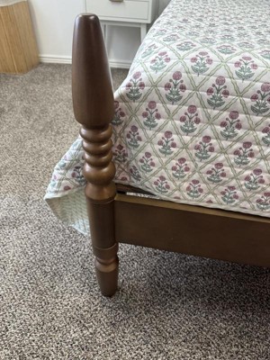 We've had this bedframe for a short while and despite how aesthetically we find it we will be looking for a new frame. The good: it's very pretty and easy to assemble. The not so awesome: one of the spindles won't stay on and the bed frame is not very sturdy. It moves so much...with an small movement the bed jostles it's occupants. It's a bummer because we were really excited to buy this bed alas it's not worth it.
