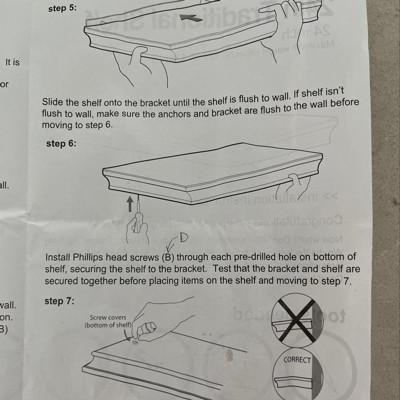 shelf is good quality, and for the size a good price. i got the shelf but it came with NO HARDWEAR. It had the bracket the hardwear attached to but no screws,anchors or anything. luckily i had some laying around i had bought from target months ago. ALSO no insctuctions. so i was so confused at first. but once i looked at other peoples photos and fiugred out where the screw owuld go, i was good. inconvient but not unmanageble. had i not had the matierials i would have been a lilttle more upset.