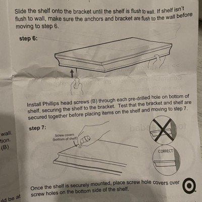 The screws that are intended to go from bottom to top to secure the shelf to the bracket are too long. They came through the top of the shelf when all the way screwed in. Super disappointing. Otherwise Pretty.