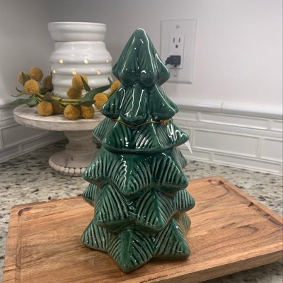 - Elevate your holiday decor with the TC01573 Transpac Ceramic 9.25" Green Christmas Iridescent Tree Cookie Jar, a foodsafe, decorative ceramic jar perfect for storing treats and enhancing your tabletop during the festive season.