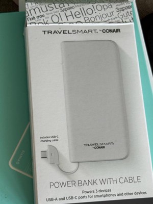 The TravelSmart® by Conair Power Bank with Cable is the ultimate solution for staying charged while traveling or on the go. Designed with convenience in mind, this ultra-slim power bank features a powerful 10,000mAh capacity that allows you to charge multiple devices simultaneously. It’s equipped with both USB-A and USB-C ports, giving you the flexibility to charge smartphones, tablets, or other gadgets that require different connections. The built-in USB-C cable means you can quickly charge your power bank and compatible devices without having to carry extra cords. Perfect for any traveler, this power bank is compact enough to slip into your bag or pocket yet powerful enough to provide up to 3 full charges for most smartphones. The battery charge-level indicator lets you know when it’s time to recharge the power bank itself. Whether you’re flying cross-country or exploring a new city, the TravelSmart® Power Bank ensures you’ll have the power you need to stay connected. Stay powered up during your travels and never worry about finding an outlet again. With TravelSmart®, charging your devices is made easy, efficient, and portable.