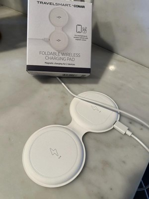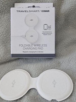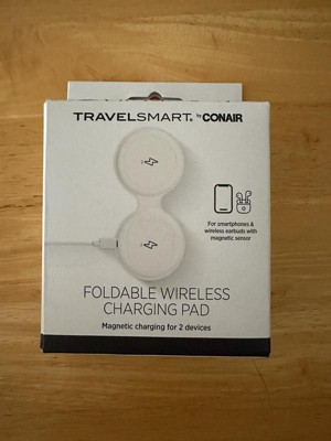 The TravelSmart® by Conair Foldable Wireless Charging Pad is the ultimate solution for charging 2 devices simultaneously with ease. This compact and portable charging pad, equipped with magnetic sensors, is designed for smartphones and wireless earbuds. Simply plug in the power cable, unfold the charging pad, and place your devices on the magnetic pads for quick charging. With a total output of 15W, the pad delivers fast charging for 2 devices at once, so you can power up your smartphone and earbuds without waiting. Its magnetic design ensures that your devices stay securely in place while charging, preventing slips or interruptions. Whether you’re traveling, working, or just on the go, this foldable charging pad makes it easy to stay connected and charged. Its compact size folds into a 3 x 3-inch disk, so you can slip it into your bag or pocket without taking up valuable space. The TravelSmart® Foldable Wireless Charging Pad is ideal for those who want to charge multiple devices quickly and efficiently while maintaining a tidy, portable setup. Stay powered up wherever life takes you with this innovative, user-friendly solution.