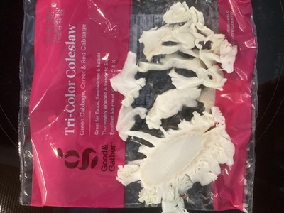 For a classic side to your picnic or barbecue fare, Good & Gather™ Tri-Color Coleslaw makes a great pick. This traditional coleslaw comes thoroughly washed so it's ready to serve right out of the package, significantly cutting down on prep time. Keep it chilled until it's time to serve, then pair it with turkey burgers or pulled pork sandwiches, accompanied by corn on the cob and potato salad for a meal that's sure to please. Your family will love the great flavor of this ready-made coleslaw.
