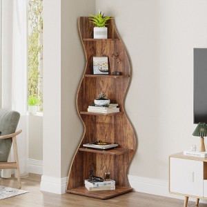 Tribesigns Wavy Corner Shelf, Modern 5-Tier Bookshelf Bookcase with Curvy Shape, Unique Plant Stand Display Rack for Living Room Small Space (Brown)
