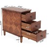 Each drawer front of this narrow side table is adorned with classic bronze hardware, and square patterns embellish both sides. Inspired by the elegant style, this 3-drawer nightstand adds a touch of retro aesthetics to your bedroom and living room. This no-assembly table serves not only as an narrow end or side table in the living room, but also as a small nightstand or bedside table in the bedroom.