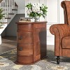 The side table is an Early America-style table in brown, has an attractive vintage appearance, the smooth surface that it's easy to clean; and arc unique design look more comfortable and gentle, reduce the risk of knock, more safety for children.